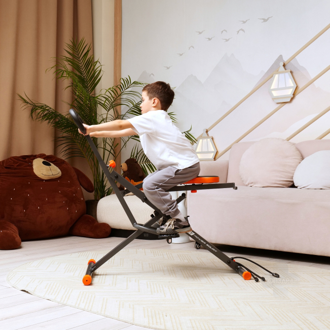 Тренажёр «наездник» DFC Rider VT-302 предназначен для домашнего использования и применяется для тренировки всего тела и быстрого сброса веса. Особая конструкция сочетает упражнения гребли и приседания одновременно, что даёт нагрузку на все группы мышц: руки, плечи, корпус, ноги. Нагрузка Механическую нагрузку создают ремни-утяжелители, закреплённые между сиденьем и рамой. Максимальная нагрузка в базовой комплектации — 15 кг (3 ремня по 5 кг). Для снижения нагрузки нужно открепить один или два ремня или закрепить дополнительные. Регулировка тренажёра Для удобства использования предусмотрена механическая система регулировки при помощи рукоятки. Сиденье с мягкой обивкой регулируется в 5 положениях по горизонтали и в 3 по вертикали (0, 10, 20 градусов). Руль регулируется в 4 положениях. Безопасная конструкция Корпус изготовлен из стальной трубы размерами 40 х 20 х 1,5 мм и 38 х 1,5 мм. Тренажёр выдерживает вес пользователя до 110 кг. Для безопасности и защиты от скольжения педали оснащены рифлёным покрытием. Удобство использования За счёт компенсаторов неровности пола тренажёр можно установить в любом помещении. Транспортировочные ролики облегчают его перемещение, а складная конструкция гарантирует удобство хранения. Тренажёр очень компактный: размеры в рабочем состоянии — 100 х 50 х 125 см.